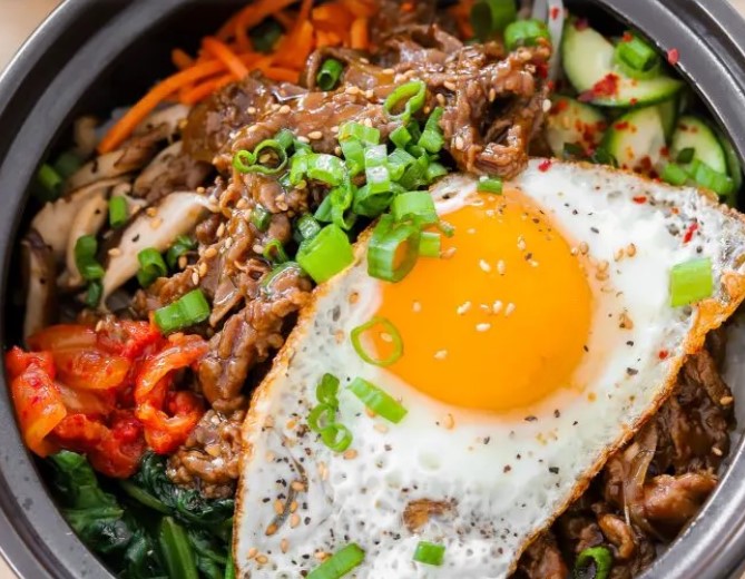 Bibimbap (literally “mixed rice”) is a famous Korean dish consisting of a bowl of warm rice topped with various seasoned vegetables (called namul), a protein (often beef), a fried egg, and gochujang (chili pepper paste). It’s all mixed together just before eating.