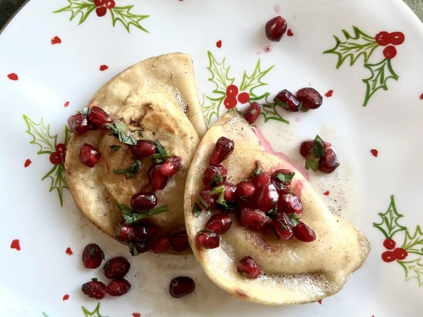 • Serve: Transfer hot pierogies and brown butter sauce to a platter. Top generously with the fresh pomegranate gremolata. Serve immediately.