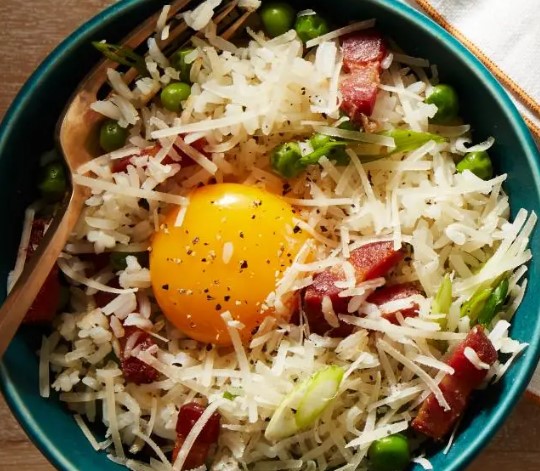 4Plate and top: Divide the rice among 4 bowls. Sprinkle each serving with 1/4 cup Parmesan cheese. Create a small well in the center of each and gently slide in an egg yolk. Finish with extra black pepper if desired.