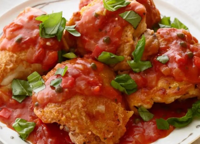 - Stir in diced tomatoes with juice, chicken broth, capers, and oregano. Return chicken to the pan, coating with the sauce.