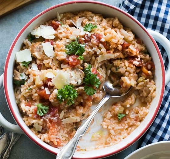 This recipe was born out of pure weeknight necessity. After a long day, I craved the comforting luxury of a perfect risotto but had zero energy for the 30 minute stir fest. Inspired by traditional Italian methods and a desire for simplicity, I adapted the process for the oven. Browning Italian chicken sausage first builds a fantastic flavor base right in the pot, then the Arborio rice, aromatics, and broth bake together until perfectly tender. It’s a method that feels almost too good to be true. The first time I pulled the bubbling Dutch oven from my kitchen and lifted the lid to that incredible aroma, I knew this was a keeper recipe; the kind you make for a casual family dinner but is impressive enough for company.