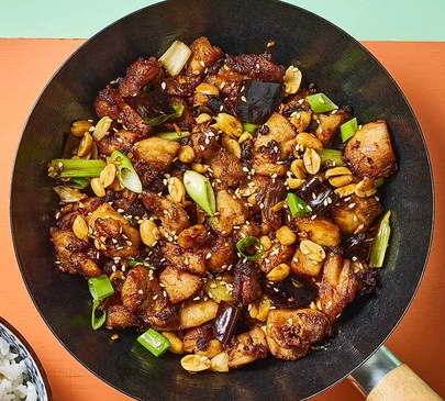 • Heat 2 tbsp oil in wok. Stir fry peppercorns and chilies 30 secs.