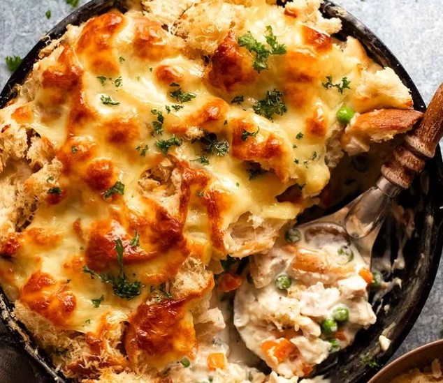 Flavor Profile: This is the epitome of cozy, savory satisfaction. Imagine a rich, creamy, and herbaceous gravy, studded with tender turkey, sweet peas, and earthy mushrooms. Now, picture that nestled under a topping of golden, garlic butter toasted bread cubes that soak up the sauce just enough, topped with a bubbly blanket of stretchy, salty mozzarella cheese. Every bite is a perfect harmony of textures: the velvety, luscious filling, the crisp tender, garlicky bread, and the gooey, melted cheese. It’s deeply savory, comforting, and irresistibly decadent; a warm hug in a skillet that celebrates the leftovers more than the original meal.