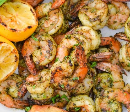 - Finish and Serve: Transfer grilled shrimp to the bowl with the reserved pesto and toss to coat. Serve immediately with lemon wedges, if desired.