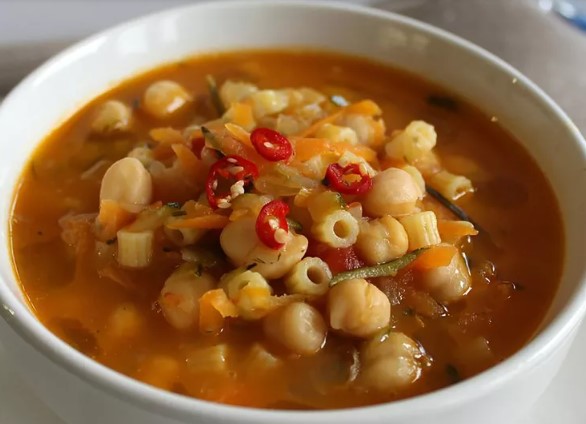 Flavor Profile: Savory and earthy from the chickpeas and broth, with sweet undertones from the grated carrots and zucchini. Fresh sage, rosemary, and thyme add an aromatic, woodsy note. The cayenne pepper brings a gentle heat at the end, while the extra virgin olive oil adds a peppery, fruity finish. The texture is thick and stew like; creamy chickpeas, tender pasta, and a broth that clings to every spoonful.