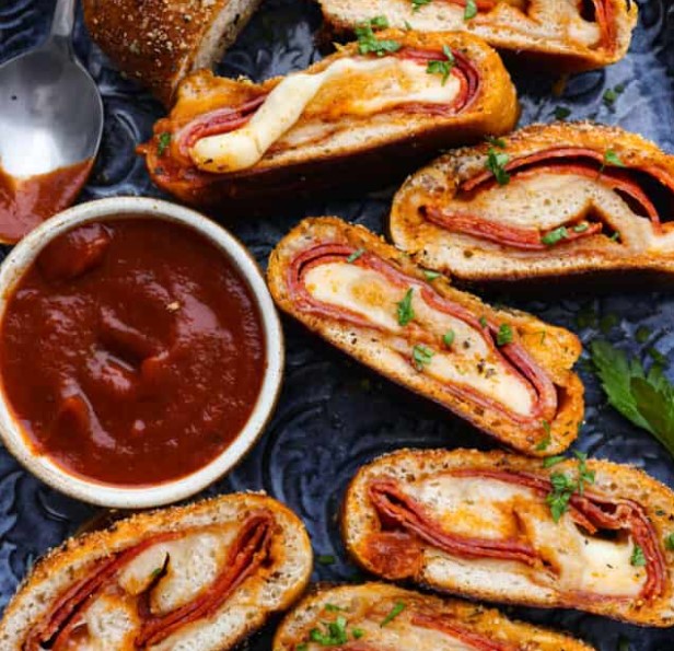 7Rest, Slice, and Serve: Remove from the oven and let it cool for 5-10 minutes. This crucial rest lets the cheese set slightly so it doesn’t all ooze out when you cut it. Garnish with chopped fresh parsley, slice into 1 inch rounds, and serve immediately with extra warm pizza sauce for dipping.