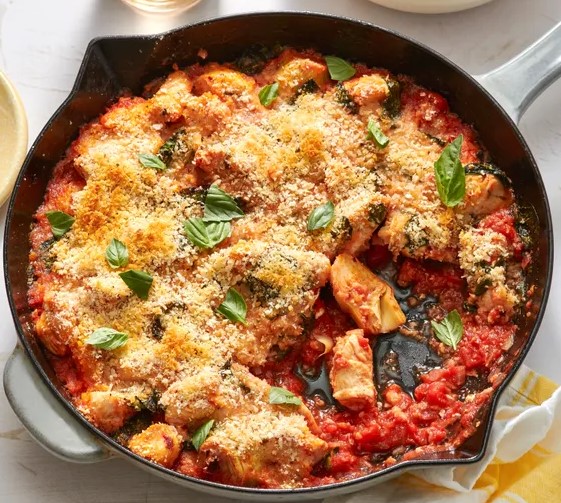What if you could take all the creamy, cheesy, irresistible flavor of spinach artichoke dip and turn it into a satisfying, protein packed dinner? Well, stop dreaming and start preheating your oven! This Spinach Artichoke Chicken Bake is here to make your weeknight meals exciting again. Tender chicken, juicy artichokes, and fresh spinach are smothered in a garlicky tomato sauce and topped with a crispy Parmesan bread crumb crust. It’s a one skillet wonder that’s elegant enough for company but easy enough for a busy Tuesday night.