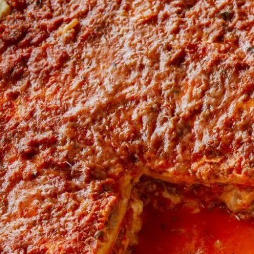 For the best slices, let the lasagna rest for 10-15 minutes after pulling it out of the oven. This allows the layers to set.